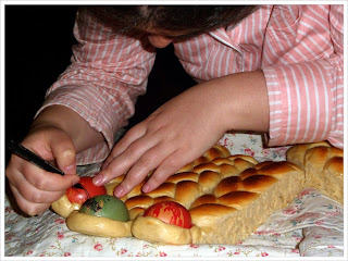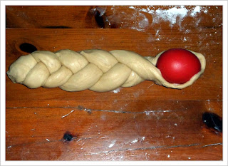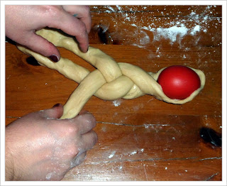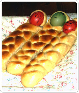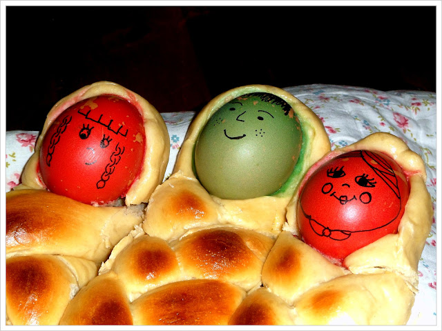 En cualquier caso, consultando algunas páginas de las que al final he tomado la receta he podido leer que estos bollitos son algo así como nuestras Monas de Pascua, nuestras Coronas o nuestros huevos de chocolate. Una manera de endulzar a los niños estos días que en muchas regiones, religiones y culturas son un tanto grises y sobrios... por eso, estos bollitos enriquecidos con leche, huevos y mantequilla son un éxito,... pero si encima los trenzas haciendo una figura que además de divertida es fácilmente comestible con la mano, mejor que mejor... ¿la guinda del pastel? Esos huevos tintados y pintados... en algunos casos por los propios niños, vaya, entretenimiento para toda la familia.